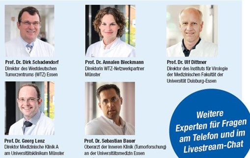 Live-Schaltungen in Ambulanzen und zu Hilfsangeboten für Betroffene runden das Format ab. Dazu Prof. Dr. Annalen Bleckmann, Direktorin des WTZ-Netzwerkpartners Münster: Neben der Beantwortung der drängendsten Fragen von PatientInnen und Angehörigen möchten wir den Betroffenen vermitteln, dass wir weiterhin für sie da sind und die bestmögliche Versorgung und Nachsorge auch in Zeiten der Pandemie sichergestellt ist – sowohl in den Ambulanzen als auch durch spezielle Hilfs- und Beratungsangebote.
