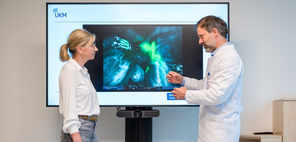Während der robotisch-assistierten OP leuchteten die betroffenen Lymphknoten hellgrün auf dem Bildschirm – sichtbar gemacht durch einen Farbstoff namens Indocyaningrün (ICG). „Die Wächterlymphknoten sind die ersten Stationen, an denen sich ein Tumor über das Lymphsystem ausbreiten würde“, erklärt Prof. Lars Hanker, Direktor der Klinik für Frauenheilkunde und Geburtshilfe sowie Leiter des Gynäkologischen Krebszentrums am UKM. „Früher mussten wir zur Sicherheit zehn oder mehr Lymphknoten auf jeder Seite des Beckens entfernen. Heute reicht es oft, gezielt nur die relevanten Lymphknoten zu entnehmen – das bedeutet ein geringeres Komplikationsrisiko und eine schnellere Genesung.“