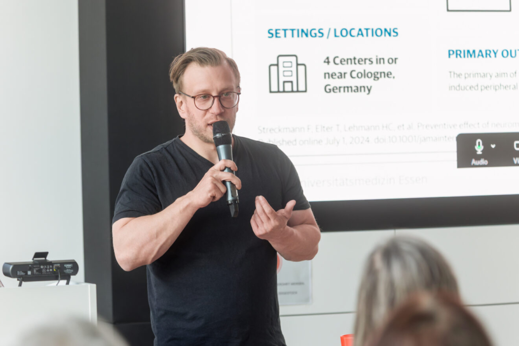 Es folgte die Keynote von Prof. Dr. med. Dr. rer. nat. Mark Stettner, Leiter der Poliklinik und Oberarzt der Klinik für Neurologie an der UME und Inhaber der Professur für Immunologie neuroinfektiologischer Erkrankungen. In seinem Vortrag beleuchtete er die Ursachen, Ausprägungen und aktuelle Forschungsansätze zur Polyneuropathie und bot einen fundierten Überblick über die komplexen neurobiologischen Zusammenhänge. Dabei machte er den Besucher*innen deutlich, dass Polyneuropathie mehr als ein Symptom ist und die Ursache für eine relevante Beeinträchtigung der Lebensqualität sein kann. Entscheidend seien jedoch zudem – neben den körperlichen Einschränkungen – sekundäre und subjektive Belastungen, die von Ärzt*innen zuweilen übersehen werden.